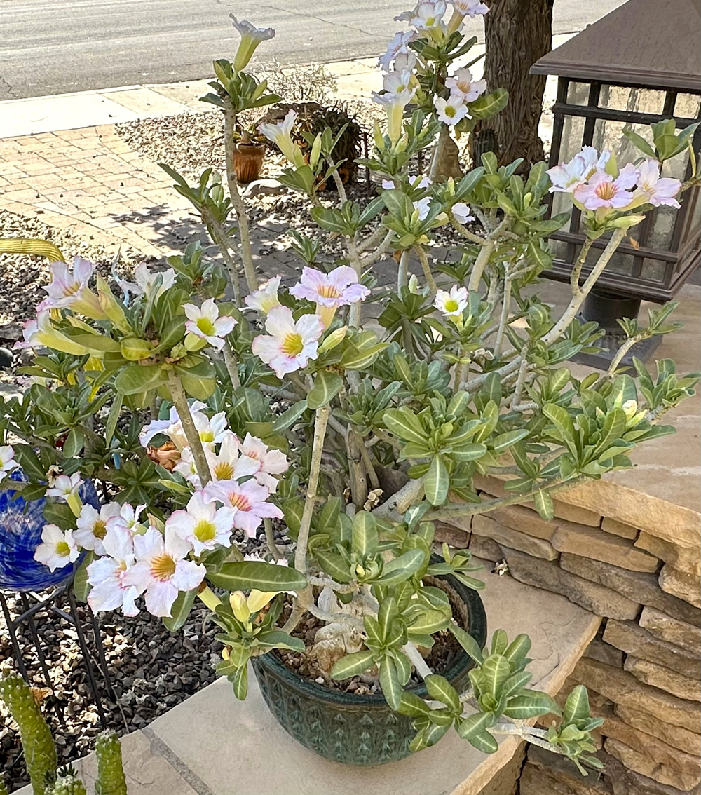Caring for adeniums is not difficult. They grow best here in pots – particularly terra cotta pots. They thrive in temperatures between 50 and 100++ degrees and go dormant in our Arizona winters. They do need protection from the cold, and most people bring them inside once the nighttime temperatures dip below 50 degrees. I have four adeniums, and they go in the garage in November, and come back outside in late February. I do have a very large one that is now too big to bring inside, so it goes under the covered patio; and if it’s going to get really cold, I cover it with frost cloth. This has worked well for me for at least a decade. Some of them are deciduous, and some keep their leaves through the dormant period. They do not get any water at all during their dormancy, since that would likely cause the caudex to rot.